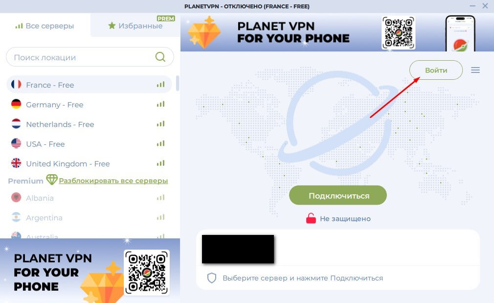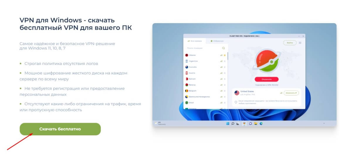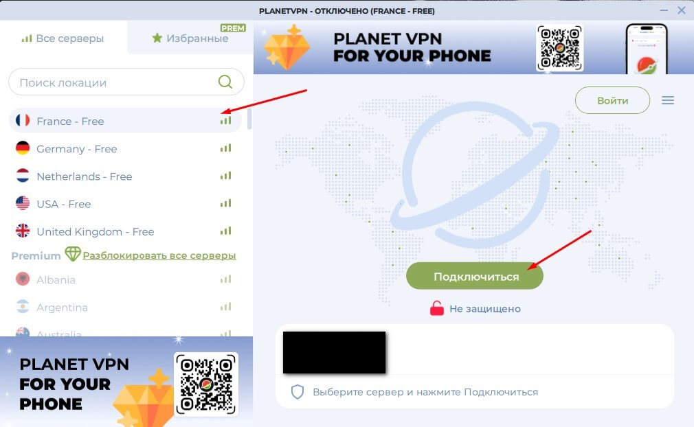 Чтобы подключить безопасное и анонимное соединение, выберите одну из доступных стран и нажмите на зеленую кнопку «Подключиться»: