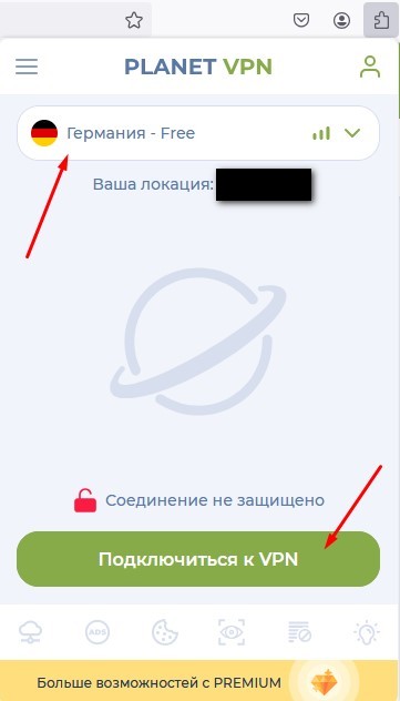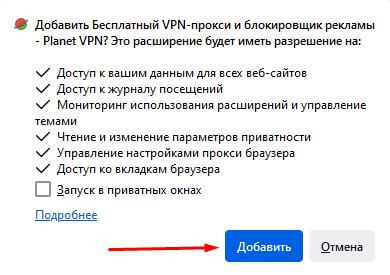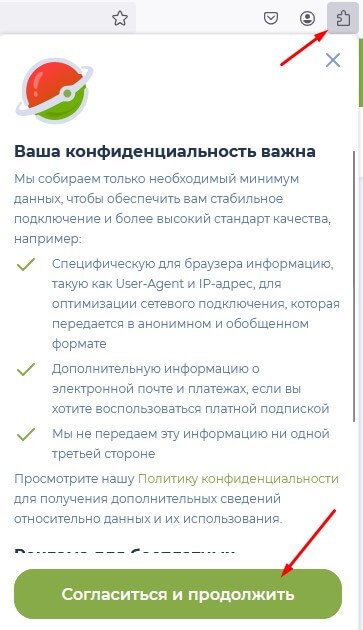 Запустить Planet VPN можно из меню расширений, при первом запуске потребуется подтвердить согласие с установленными правилами: