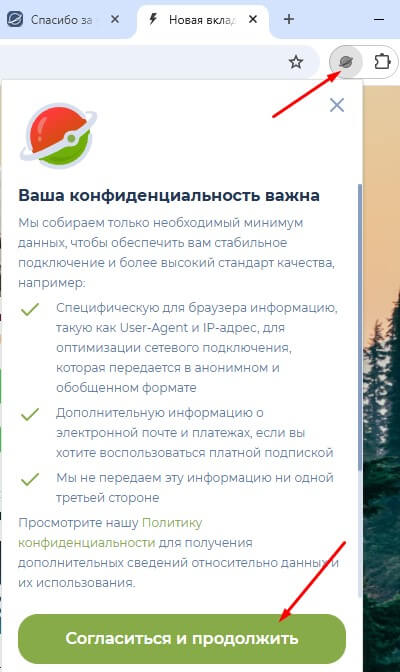 Запуск установленного сервиса осуществляется нажатием на кнопку с изображением планеты рядом с адресной строкой или из меню расширений. При первоначальном запуске потребуется согласиться с условиями использования: