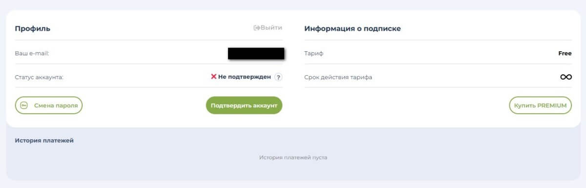 В личном кабинете пользователя можно подтвердить аккаунт, изменить пароль от учетной записи, ознакомиться с выбранным тарифом и сроком его действия, а также с историей платежных операций: