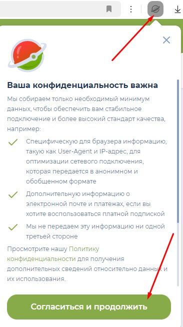 Чтобы запустить расширение, нажмите на значок с изображением планеты в верхней правой части экрана и согласитесь с установленными правилами использования сервиса: